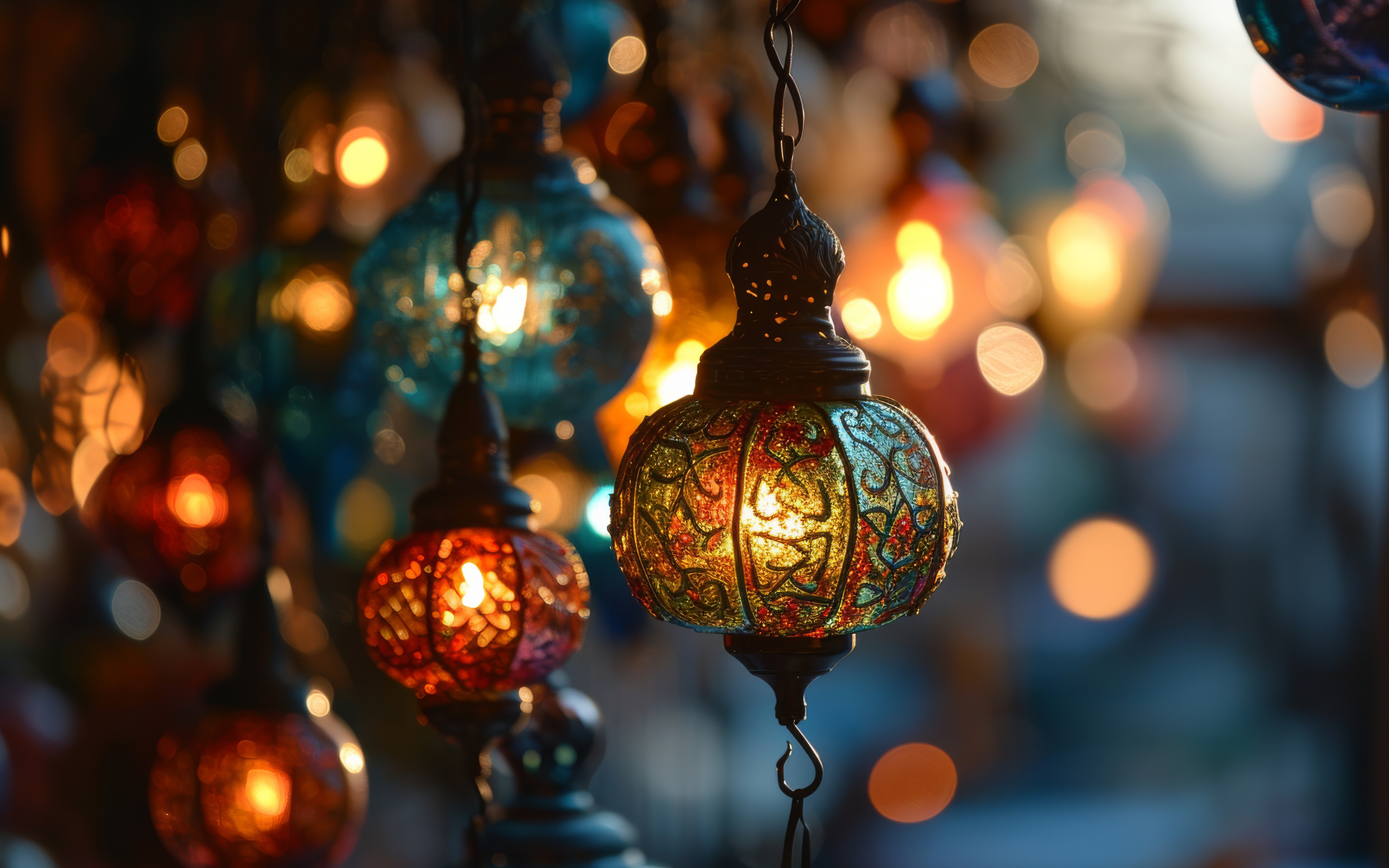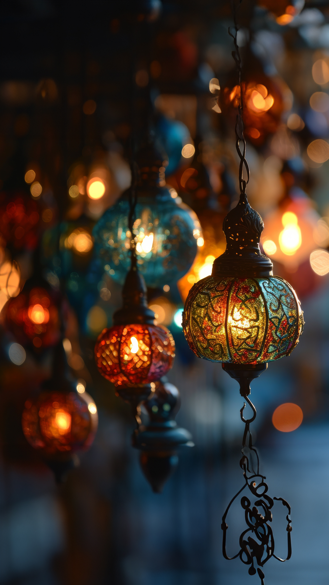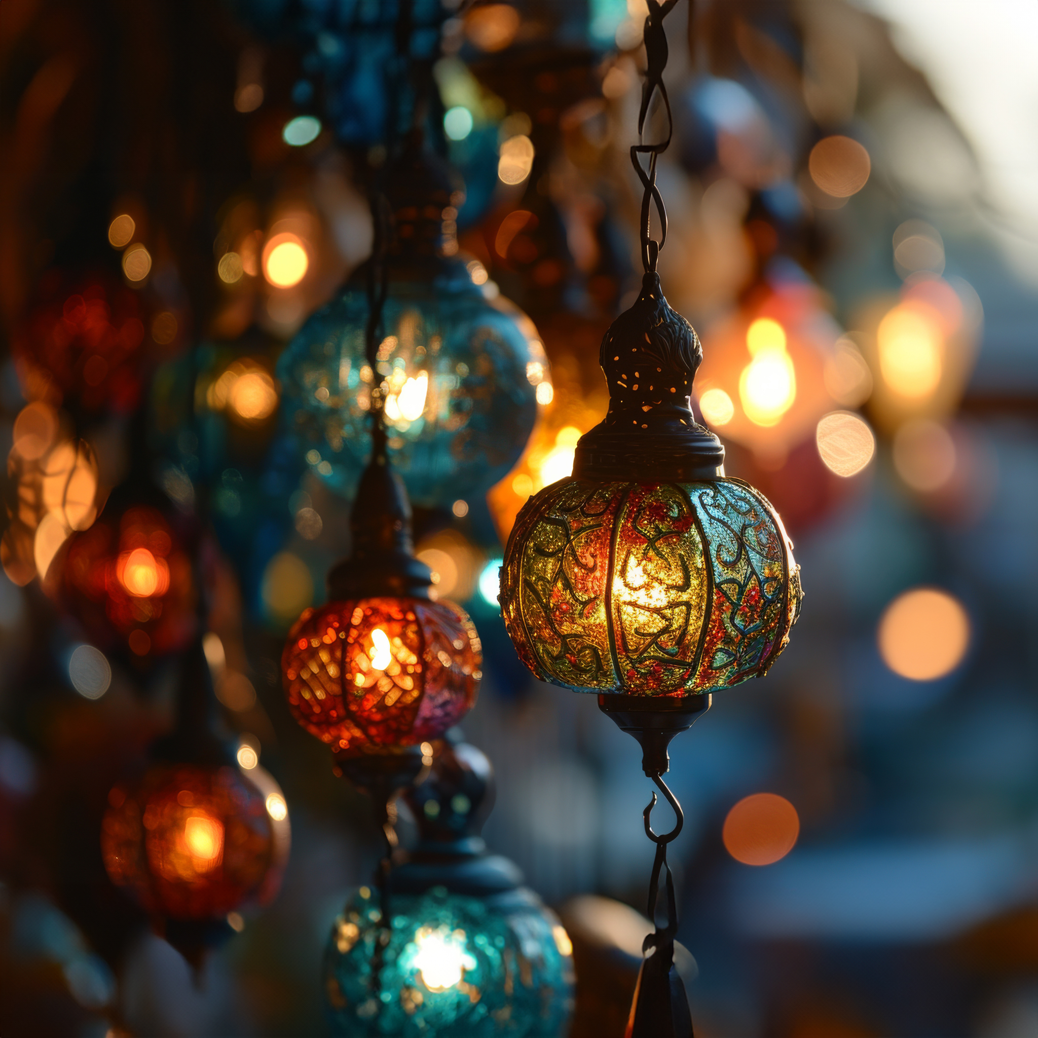 a group of colorful lights hanging from a ceiling - ai generated art - desktopsbyai.com